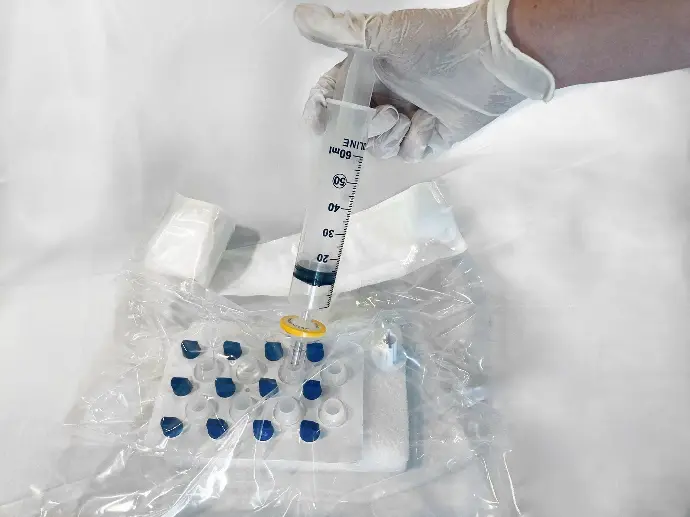 The proprietary tray secures each eye drop bottle in an upright position to assist in filling. All filling and capping of each eye drop bottle is accomplished from the exterior of the bag thereby maintaining product sterility throughout the procedure.