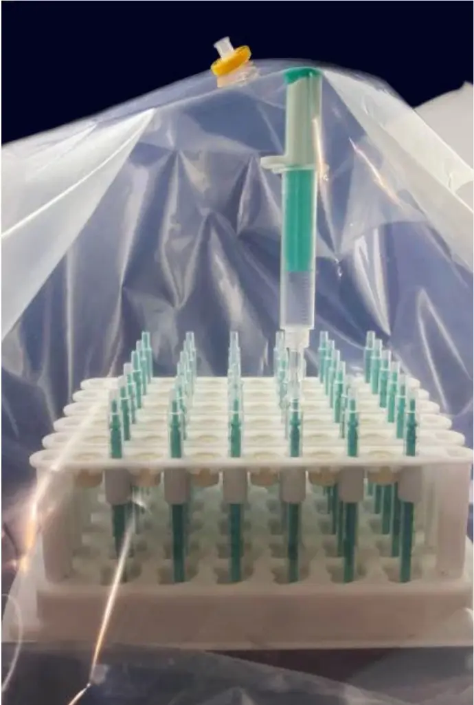 VitrALA includes a closed-system sterilized header bag and integral 0.22-micron sterilizing grade filter, with a proprietary syringe tray that enables clinicians to fill, prime and accurately measure a minimum volume of 0.07 mL per syringe. VitrALA minimizes drug loss with minimal dead space. Syringes are capped and sealed to maintain a sterile barrier before opening the header bag. Syringes can be filled easily and efficiently.